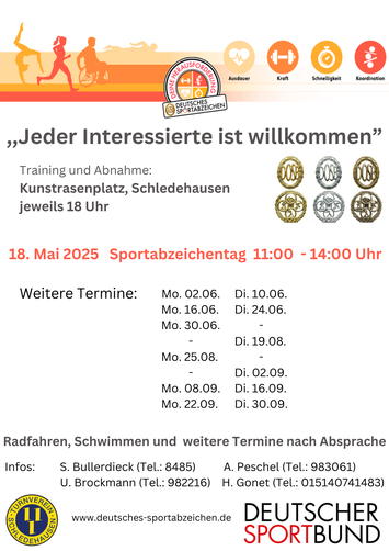 Montags und dienstags (im wöchentlichen Wechsel) von 18:00 bis 19:00 Uhr - Termine weiter unten - trainieren Übungsleiter/-innen mit Euch die einzelnen Disziplinen, so dass Ihr für die abschließende Abnahme vorbereitet seid. Jeder kann zu den Terminen am Kunstrasenplatz an der Waldsporthalle vorbeischauen und direkt mitmachen! Eine Voranmeldung ist nicht erforderlich.
